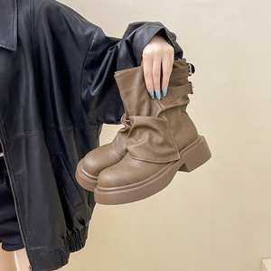 复古厚底马丁靴女秋冬法式设计休闲百搭皮靴增高显瘦裤管靴时装靴