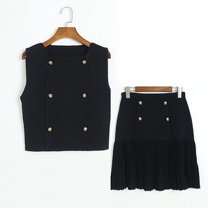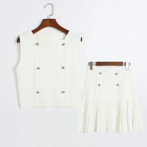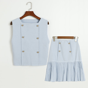 夏秋新款浅蓝色针织套装优雅双排纽扣无袖马甲百褶半身裙两件套