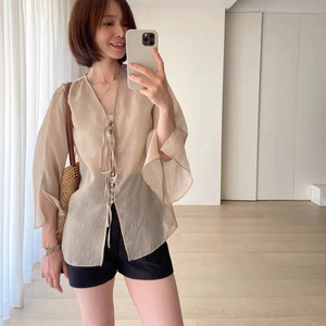 仙气氛围感~皱感压花纱 优雅喇叭袖V领开衫外套女 开衫