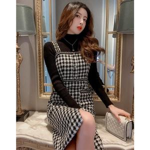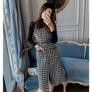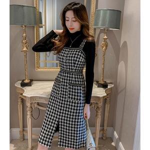 轻奢毛呢格子吊带裙两件套小香春秋气质女神范修身背带连衣裙套装