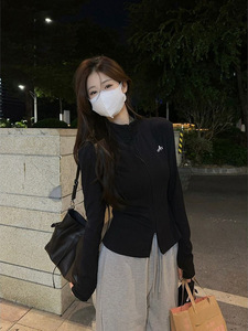 秋季新款刺绣双拉链长袖内搭t恤卫衣女春秋修身显瘦打底衫上衣ins
