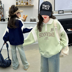 女孩秋季POLO领上衣潮中大童拼色运动风春季新款翻领洋气时尚卫衣