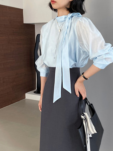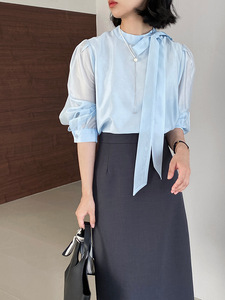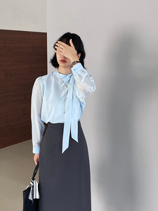 江左 蝴蝶结飘带天丝半高领长袖衬衫女秋季新款通勤衬衣小衫 1186