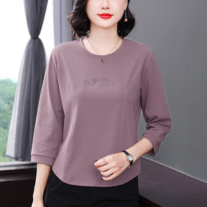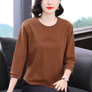 2025秋季新款妈妈装圆领拼接时尚宽松刺绣遮肚七分袖纯色上衣