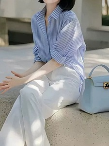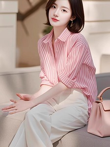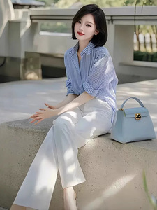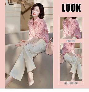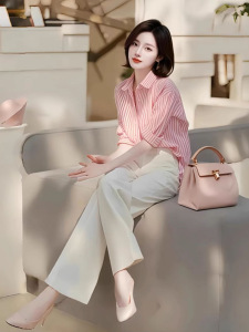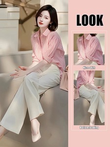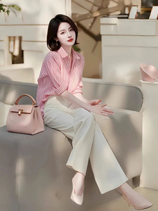 复古巨好看的套装女新中式国风粉色条纹上衣显瘦阔腿裤两件套早秋