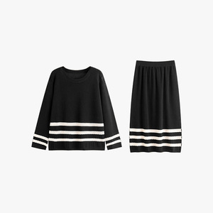 大码撞色显瘦条纹套装2025秋胖mm宽松圆领上衣女半裙两件套23212