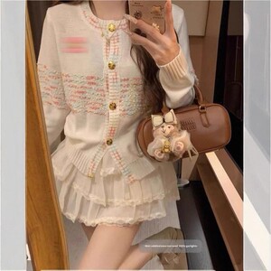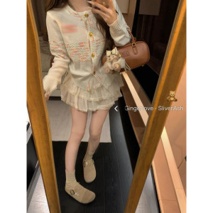 法式复古时尚小香彩色刺绣毛衣圆领单排扣字母针织开衫外套上衣女