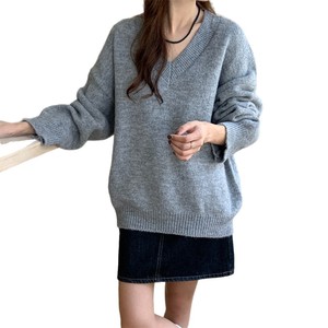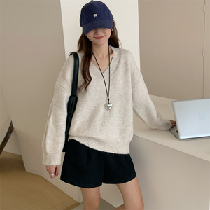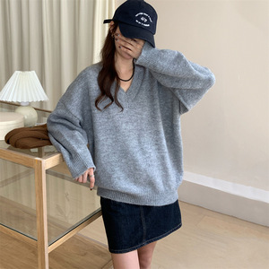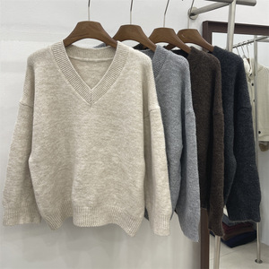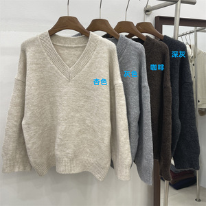 跨境大码慵懒V领气质套头毛衣女秋冬新款内搭针织打底衫宽松上衣