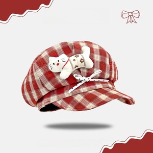 宅系格纹小猫咪八角帽子女2025新款秋季y2k可爱复古显脸小贝雷帽