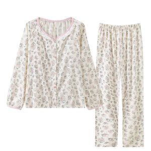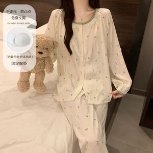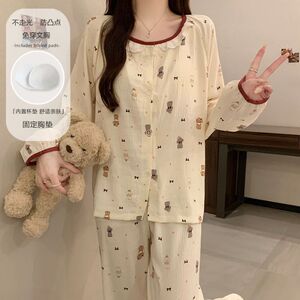 甜美小香风睡衣女秋季新款云朵棉圆领开衫长袖带固定胸垫睡衣套装