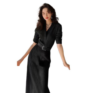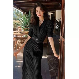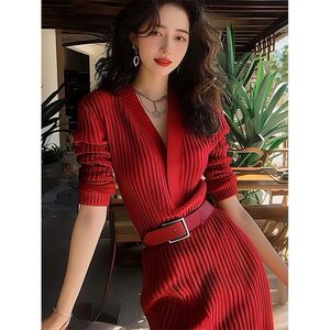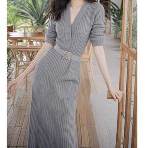 灰色v领针织连衣裙女2025新款秋季轻奢高级感大方得体的裙子收腰