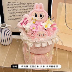 玩偶香皂粉色半身拉布布花束+礼袋+灯串+贺卡