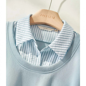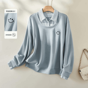 2025秋季新款简约百搭笑脸刺绣设计假两件拼接撞色翻领宽松卫衣女