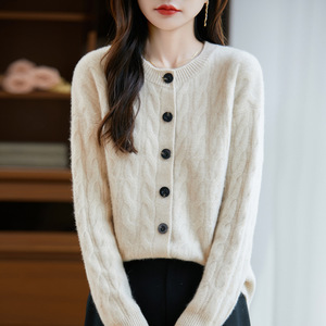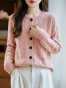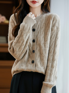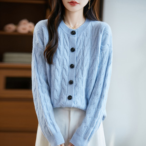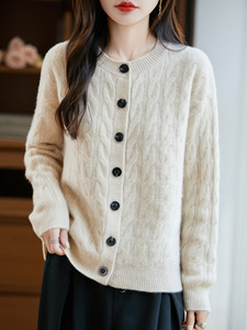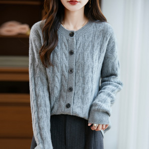 秋冬新款加厚纯羊毛开衫女圆领百搭毛衣扭花宽松百搭上衣针织外套
