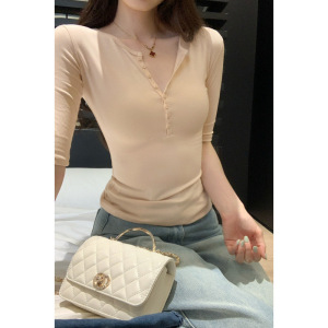欧货半排扣正肩中袖T恤女夏2025新款修身显瘦绝美五分袖上衣女