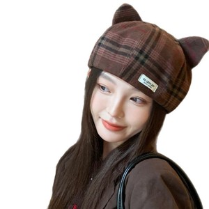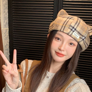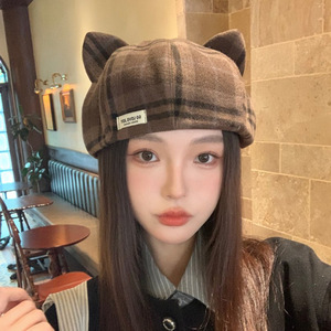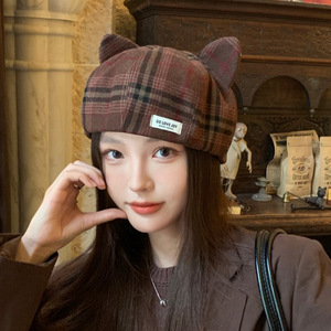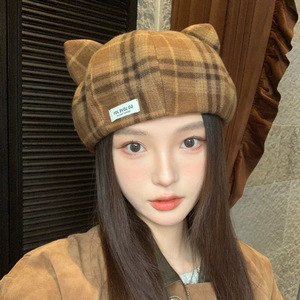 复古格纹猫耳朵贝雷帽子女春秋显脸小百搭毛呢画家帽保暖南瓜帽