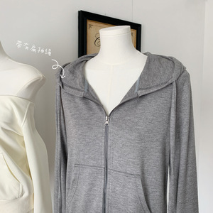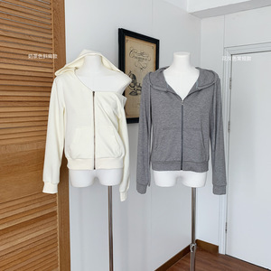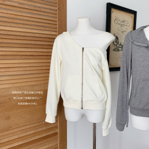 把妹王白色连帽卫衣拉链外套女薄款斜肩短款开衫上衣