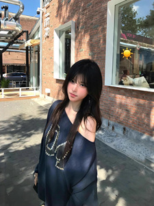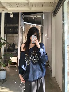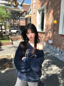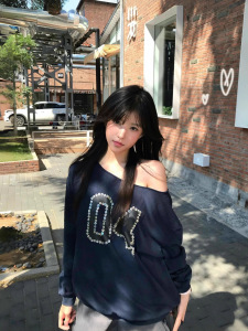 藏青色数字扣子斜肩套头卫衣女秋季美式慵懒宽松辣妹小众长袖上衣
