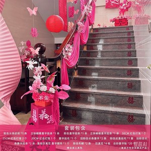粉色楼梯扶手装饰结婚墙面婚房氛围感场景布置蝴蝶拉花感女方