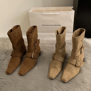 MuXuan~ 两穿方头粗跟短靴女小众设计感翻折中筒靴法式复古西部靴