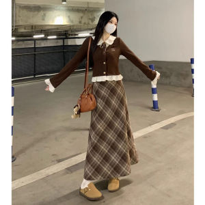 小个子美拉德穿搭复古格纹半身裙设计感拼接长袖上衣套装秋冬季女