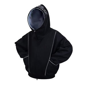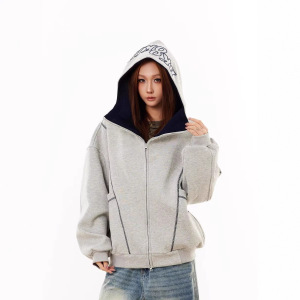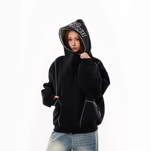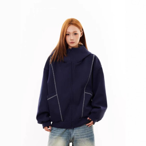 复古半高领开衫卫衣连帽女秋冬季廓形明线慵懒风百搭嘻哈拉链外套