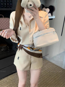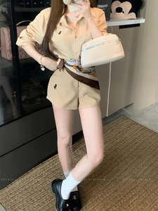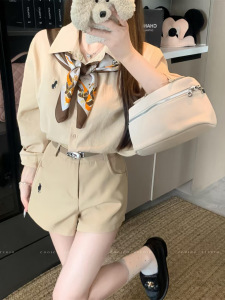 高品质~早秋新款老钱风小众百搭领长袖衬衫配丝巾+高腰短裤套装女