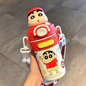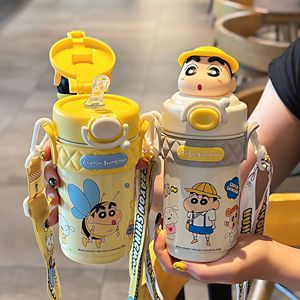蜡笔小新点点趣味保温杯可调节杯绳携带方便锁扣设计硅胶吸管水杯
