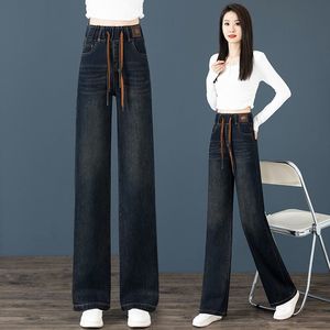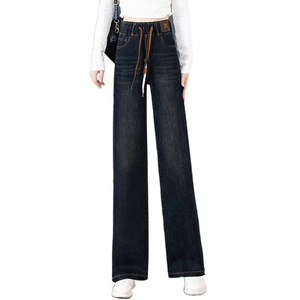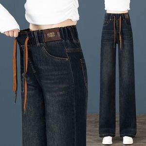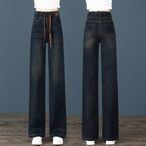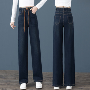 松紧腰大码宽松阔腿牛仔裤女春装年新款高腰窄版直筒长裤