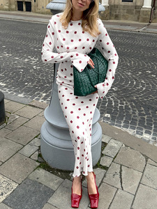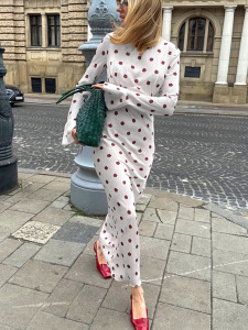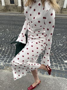 2025秋季新款跨境法式甜美纯欲风长款修身圆领喇叭袖碎花连衣裙女