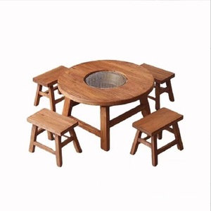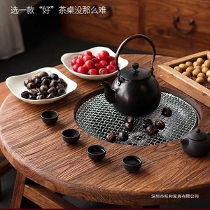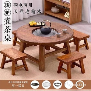 L7简易新款老榆木围炉茶桌原木小圆桌火锅煮茶桌烧烤桌家用阳台桌