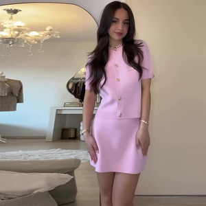 2025年新款欧美亚马逊跨境外贸女装单排扣针织修身休闲粉色裙套装