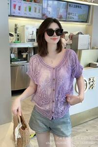 夏季高级感钩花镂空V领短袖针织衫女新款别致减龄显瘦开衫上衣潮