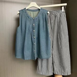 2025夏款气质港风牛仔无袖衬衫+格子阔腿裤时尚套装复古两件套
