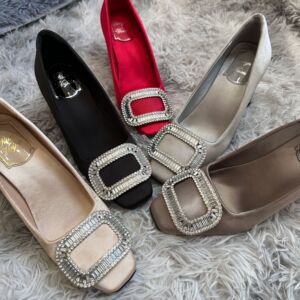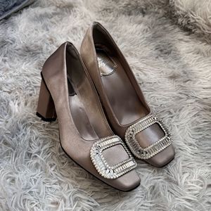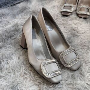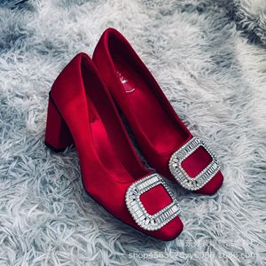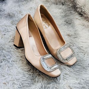 法式女浪漫粗跟水钻方扣单鞋女中跟真丝绸缎方头rv高跟鞋方头女鞋