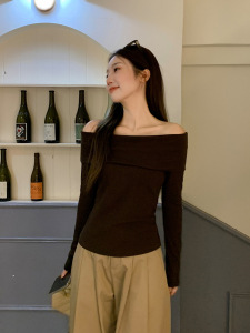设计感早秋穿搭一字领露肩长袖T恤女2025新款打底衫修身显瘦上衣