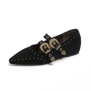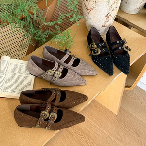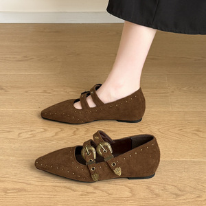 欧美复古尖头平底内增高软皮玛丽珍鞋女棕色铆钉一字带浅口单鞋女