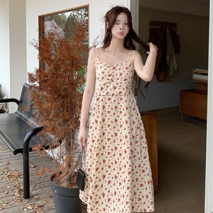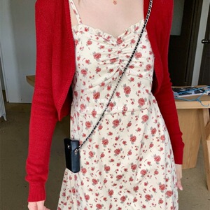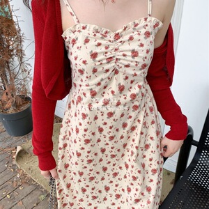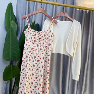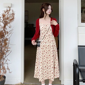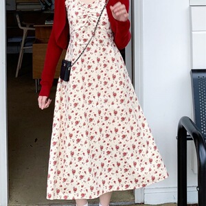 甜美碎花吊带长裙针织外搭套装裙子早秋新款打底灯芯绒连衣裙女装
