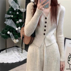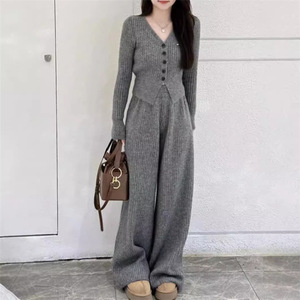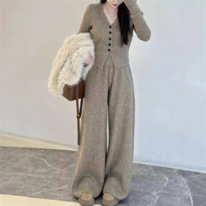 2025秋冬修身百搭毛衣套装女两件套v领开衫显瘦高腰针织衫+阔腿裤