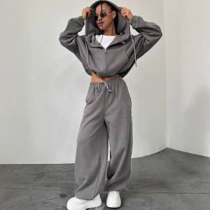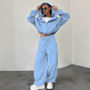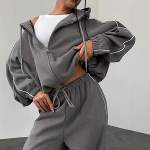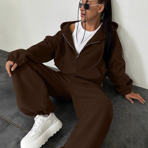 2025亚马逊跨境秋冬休闲套装女欧美连帽系带开衫松紧长裤两件套