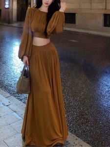 【盛宴】焦糖色蝙蝠袖圆领上衣抽褶垂感开叉半裙套装