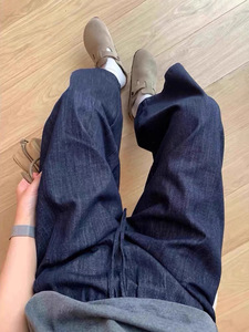 大码复古深蓝色牛仔裤女夏季薄款胖mm宽松高腰显瘦直筒阔腿九分裤