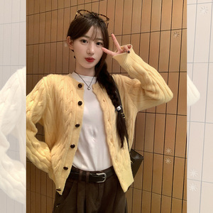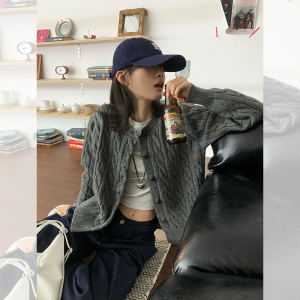 宋正恩蓝色麻花针织开衫外套女秋季新款宽松韩系慵懒毛衣长袖上衣