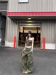 辣妹迷彩潮酷阔腿工装裤女早秋新款美式复古抽绳拖地牛仔长裤