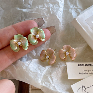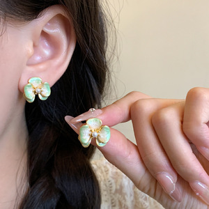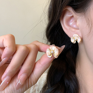 S925纯银针森系小清新滴釉花朵耳钉女法式温柔百搭气质珍珠耳环