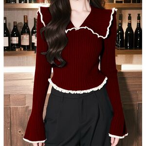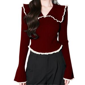 2025秋季今年流行翻领花边喇叭袖感蓝色毛衣韩系经典显白上衣