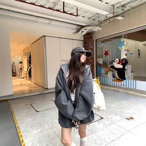实拍~秋季新款宽松长袖连帽卫衣女石岩灰休闲慵懒风上衣外套87124