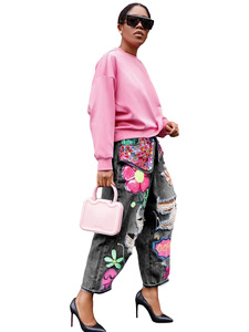 D8685 新品速卖通亚马逊跨境欧美时尚烫钻定位印花割破牛仔裤