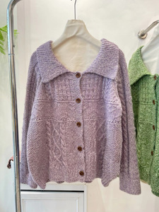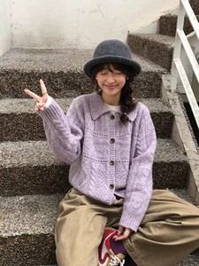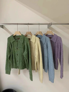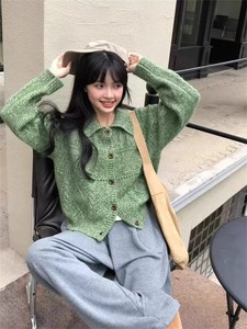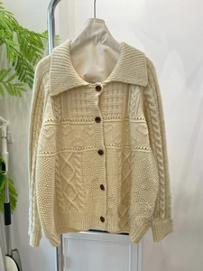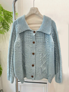 现h韩国款2025早秋全羊毛复古温柔花线翻领宽松针织开衫外套毛衣