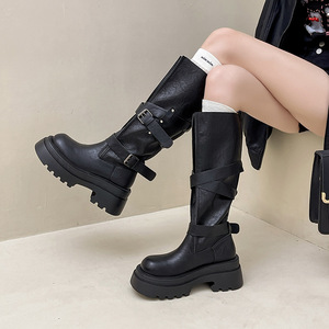 时尚百搭复古皮带扣机车靴秋季设计感女小个子皮靴厚底增高骑士靴